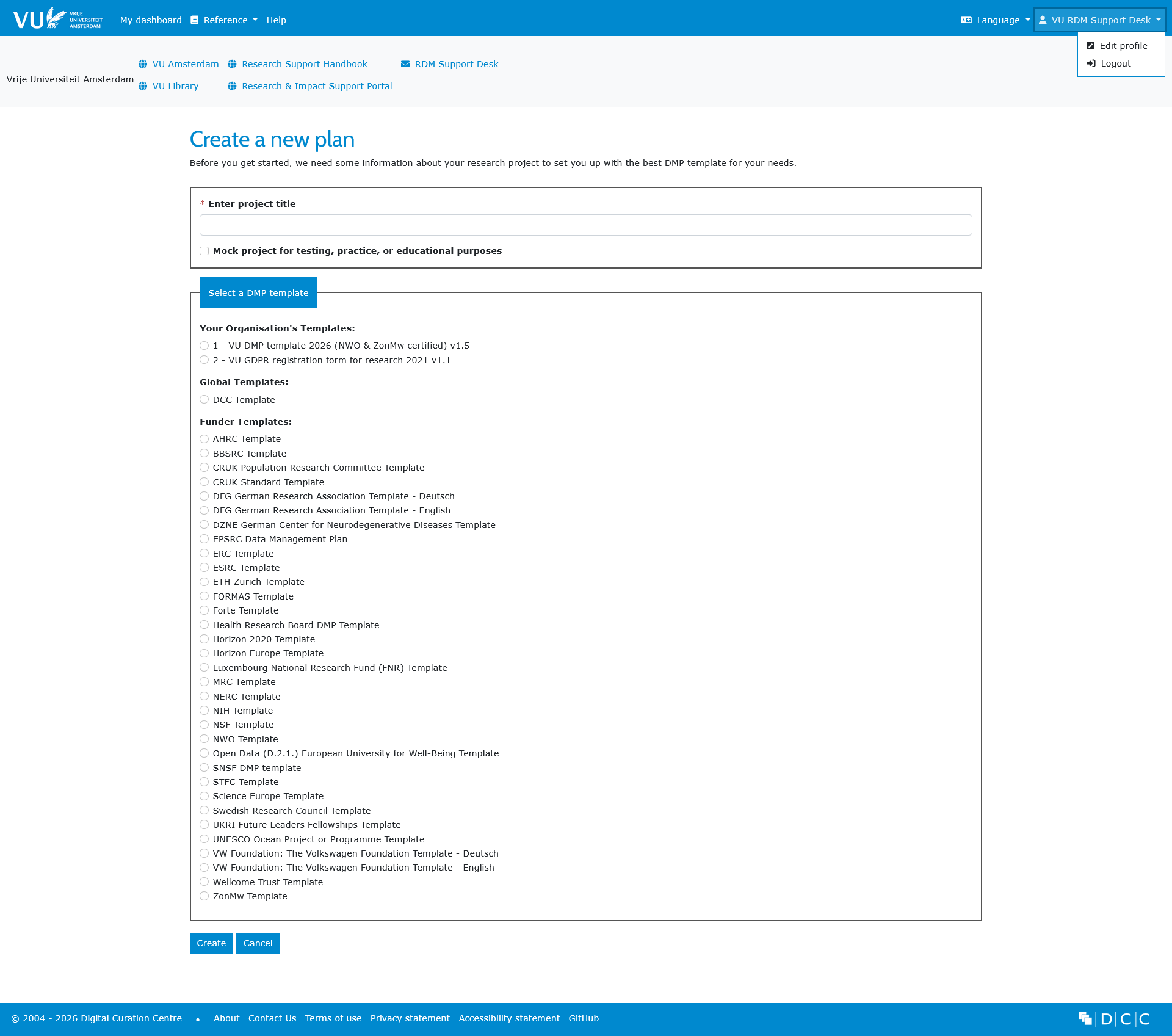 If you’re aiming to write a full DMP based on VU Amsterdam DMP template, please make sure you don’t select the GDPR registration form.