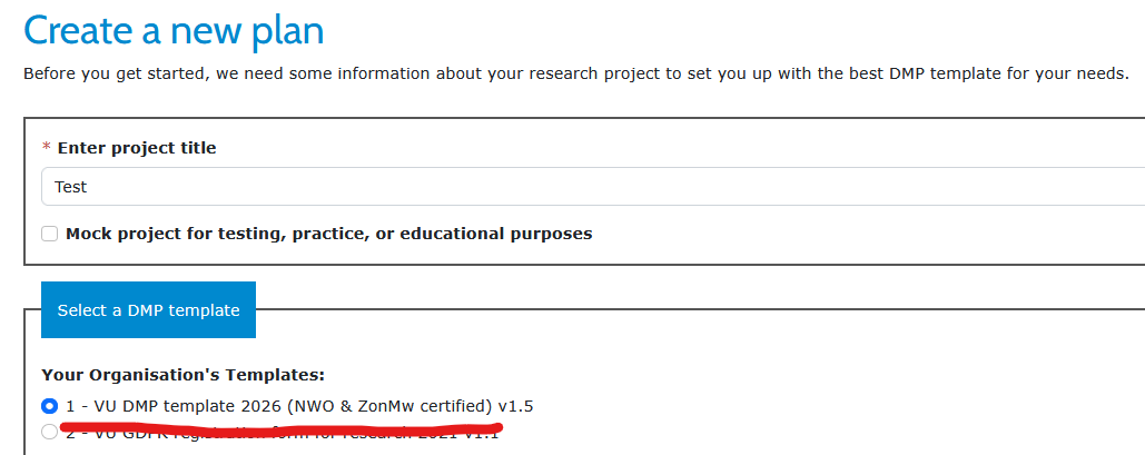 - Select the following template: ‘1 - VU DMP template 2026 (NWO & ZonMw certified v1.5’).