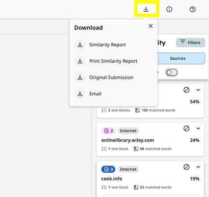 The person(s) you want to share the results with needs to have an iThenticate account. All key users for iThenticate have an iThenticate account. If you want to share the results digitally with a person without an iThenticate account (for instance your (co-)supervisor), you can save the results as a PDF file via the print icon in the bottom left corner in de detailed view. Note that reviewing the results together with your supervisor is easiest by viewing your iThenticate account together, either physically or by sharing your screen in an online meeting.