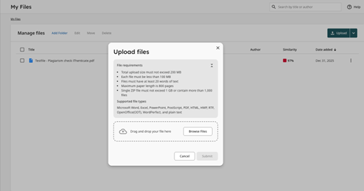 To start a new plagiarism scan you must select the folder ‘My Files’. After selecting the folder, the section ‘Upload’ appears on the right side of the screen. You can submit your document by choosing ‘Upload’.