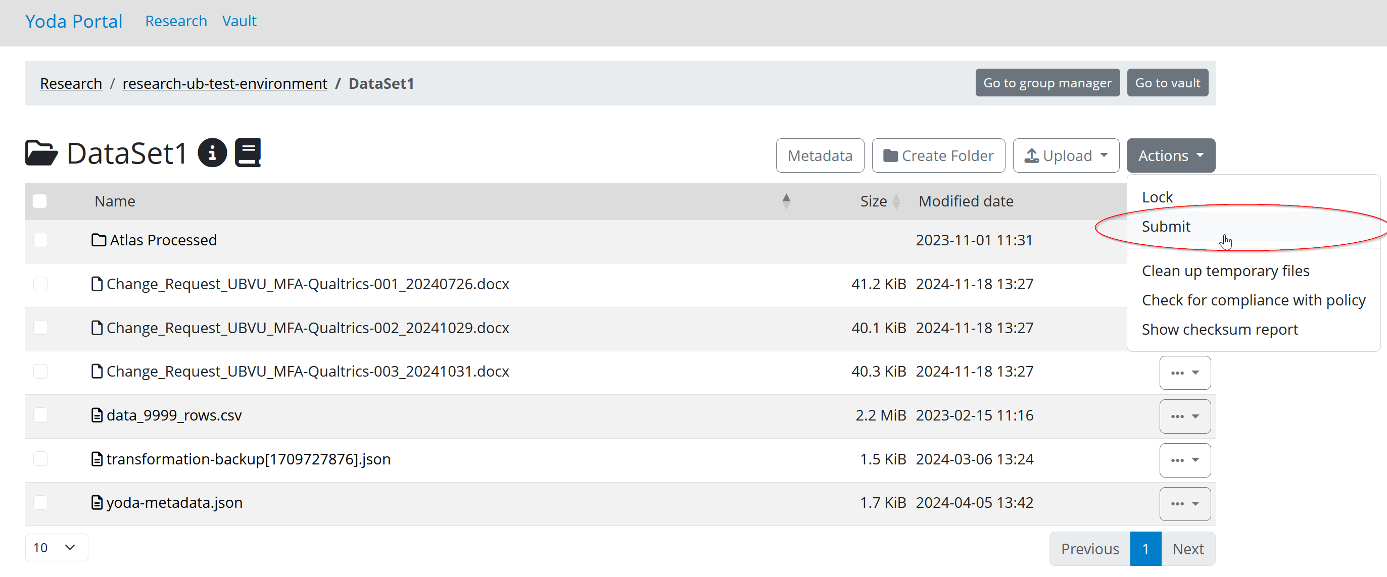 First, navigate to the folder you want to archive in the Yoda portal. Ensure that you are in the folder which you want to submit to the vault. Check that all mandatory metadata has been entered in the metadata form of the folder.