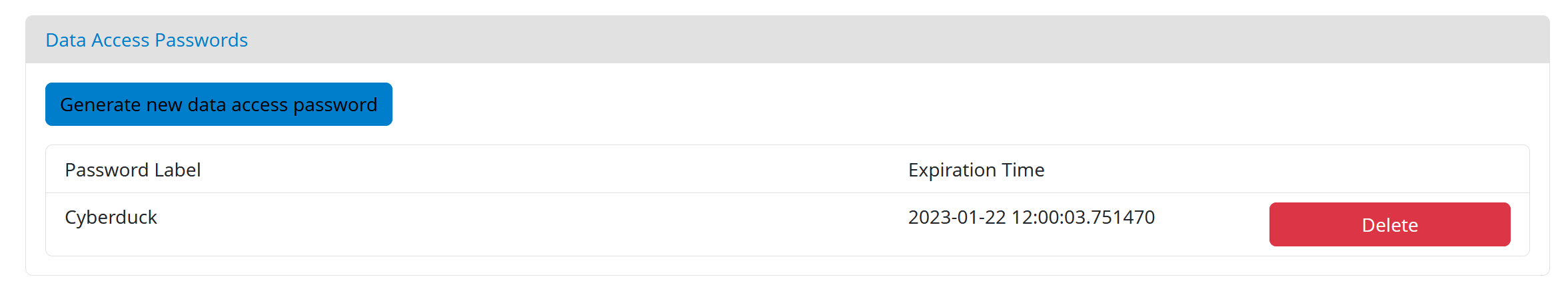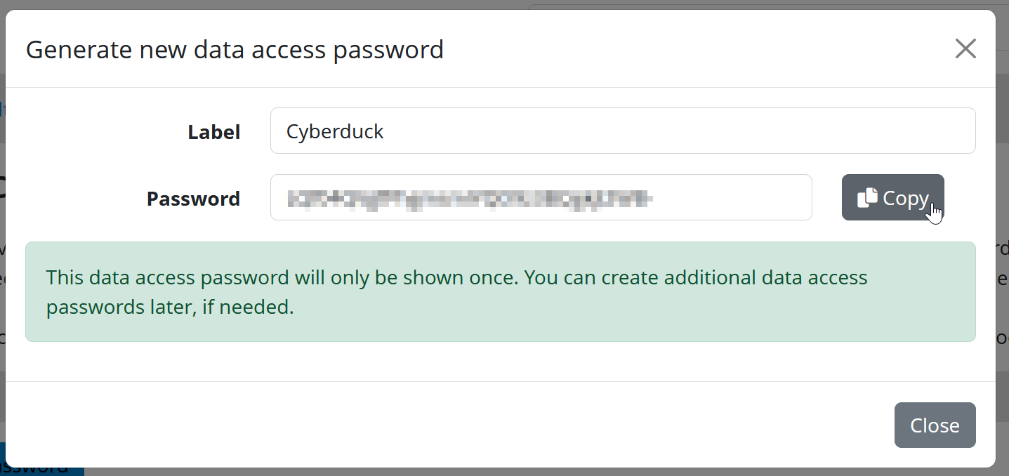 - Enter a suitable label and click on “Generate new data access password”.